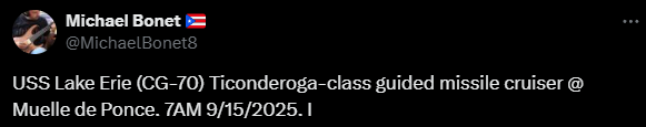 Un ciudadano puertorriqueño llamado Michael Bonet compartió varias fotografías en redes sociales del USS Lake Erie a su llegada el 15 de septiembre a las 7:00 A.M. (hora local).