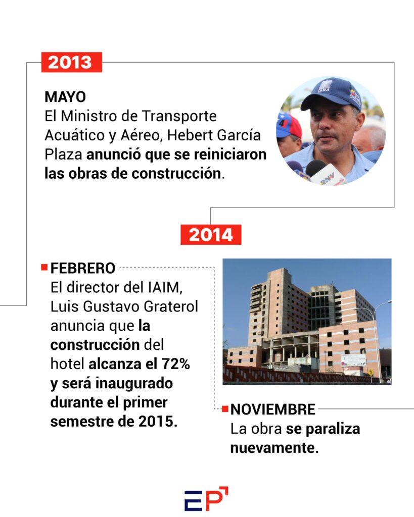 Con la llegada al poder de Nicolás Maduro en 2013, el proyecto del hotel fue reactivado. Entre ese año y el año 2016, desfilaron, al menos tres empresas contratistas, siendo la más novedosa el Fondo Global de Construcción C.A., la empresa del hoy ministro del gobierno de Nicolás Maduro, Alex Saab. En esos dos años, el Ministerio de Obras Públicas refleja en su presupuesto la inversión de al menos 38 millones de dólares en las obras del hotel. Sin embargo, para 2017, la construcción fue abandonada y la culminación se convirtió en promesa eterna, hasta este año.