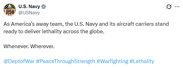 A través de su cuenta en la red social X, la Armada estadounidense definió su rol como una fuerza expedicionaria de alcance ilimitado. “Como equipo de misión de Estados Unidos, la Marina de los EEUU y sus portaaviones están preparados para causar estragos en todo el mundo. Cuando sea. Donde sea”, rezó la declaración textual.