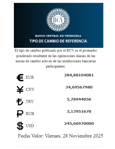 El precio del dólar estadounidense en Venezuela se mantiene en un nivel de estabilidad relativa este viernes 28 de noviembre, día del Black Friday, con una cotización oficial de 245,67 bolívares por unidad, según el Banco Central de Venezuela (BCV).