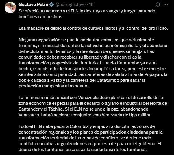 «Si el ELN no se une a la paz, abandonando Venezuela, habrá acciones conjuntas con Venezuela de tipo militar», afirmó el mandatario en un largo mensaje publicado en X, en el que insistió en que su Gobierno no negociará mientras esa guerrilla mantenga las economías ilícitas y el reclutamiento de menores.