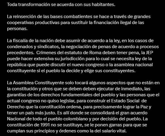 Según el grupo armado, ese acuerdo buscaría enfrentar la crisis política, social y armada del país mediante reformas económicas, ambientales y de participación popular.