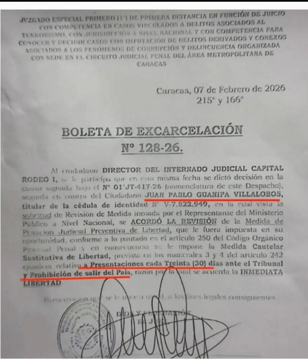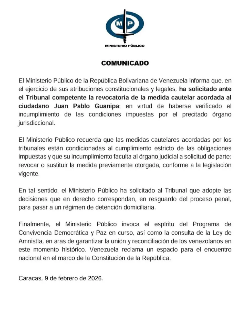 La Fiscalía General de la República revocó la excarcelación acordada el domingo 8 de febrero y ordenó que Guanipa pase a un régimen de detención domiciliaria, tras señalar supuestos incumplimientos de las condiciones impuestas en su medida cautelar.