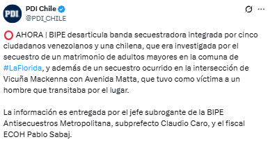 La Policía de Investigaciones (PDI) de Chile desarticuló una banda criminal dedicada al secuestro, según informó la institución en su cuenta oficial de X.