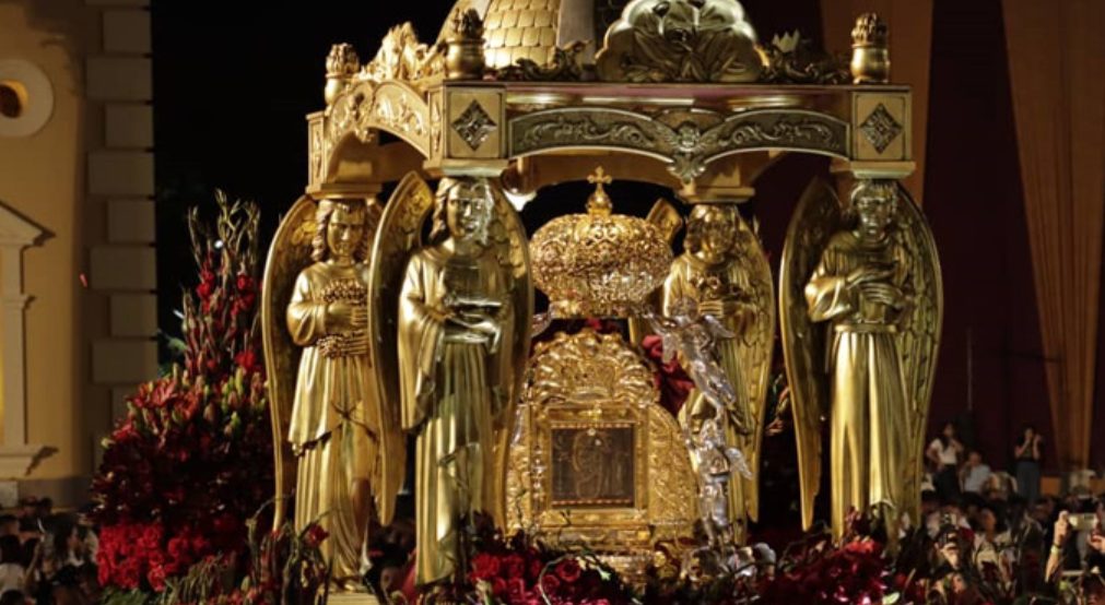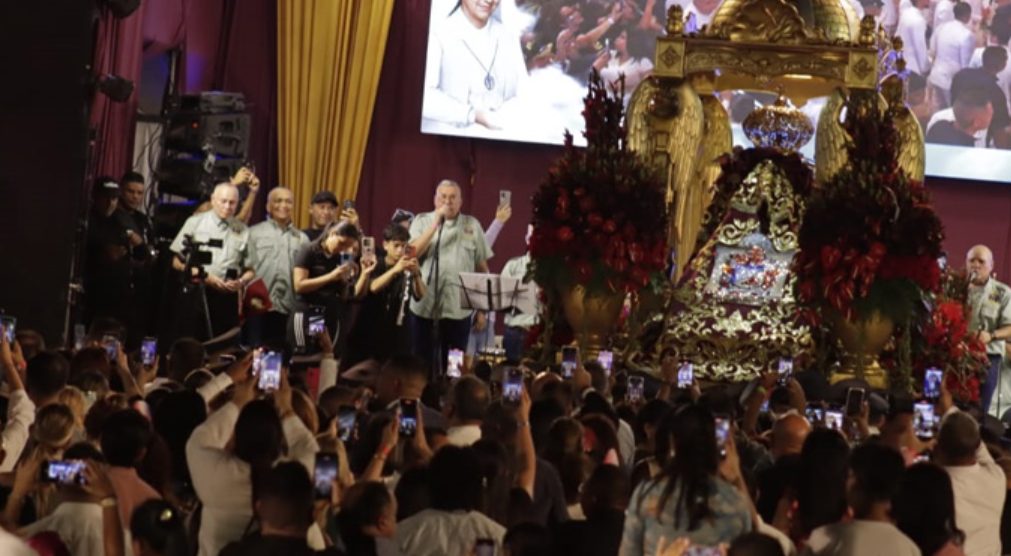 Aproximadamente 40 minutos antes, su himno Gloria a ti, informaba a la feligresía que la Santa Reliquia salía de su camarín. Mientras transcurría el tiempo, las tamboras, los furros y las charrascas sonaron para acompañar esas oraciones hechas cantos en honor a la Virgen Morena, de las voces de los Chiquinquireños.