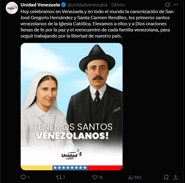 “Hoy celebramos en Venezuela y en todo el mundo la canonización de San José Gregorio Hernández y Santa Carmen Rendiles, los primeros santos venezolanos de la Iglesia Católica. Elevamos a ellos y a Dios oraciones llenas de fe por la paz y el reencuentro de cada familia venezolana, para seguir trabajando por la libertad de nuestro país”, comentó la PUD.