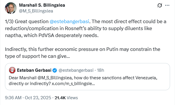 Marshall Billingslea afirmó este jueves 23 de octubre que las recientes sanciones de Estados Unidos contra la petrolera rusa Rosneft podrían afectar directamente a Venezuela, al complicar el suministro de diluyentes que requiere Petróleos de Venezuela (Pdvsa).