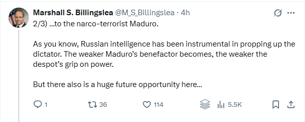 Billingslea argumentó que «la inteligencia rusa ha sido fundamental para apuntalar al dictador. Cuanto más débil se vuelve el benefactor de Maduro, más débil es el control del déspota sobre el poder».