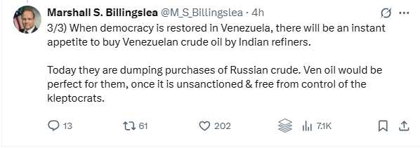 Finalmente, Billingslea mencionó una «enorme oportunidad de futuro» para el crudo venezolano si se restablece la democracia, asegurando que «habrá un apetito instantáneo por comprar petróleo crudo venezolano por parte de las refinerías indias». Afirmó que este petróleo «sería ideal para ellos, una vez que esté libre de sanciones y del control de los cleptócratas».