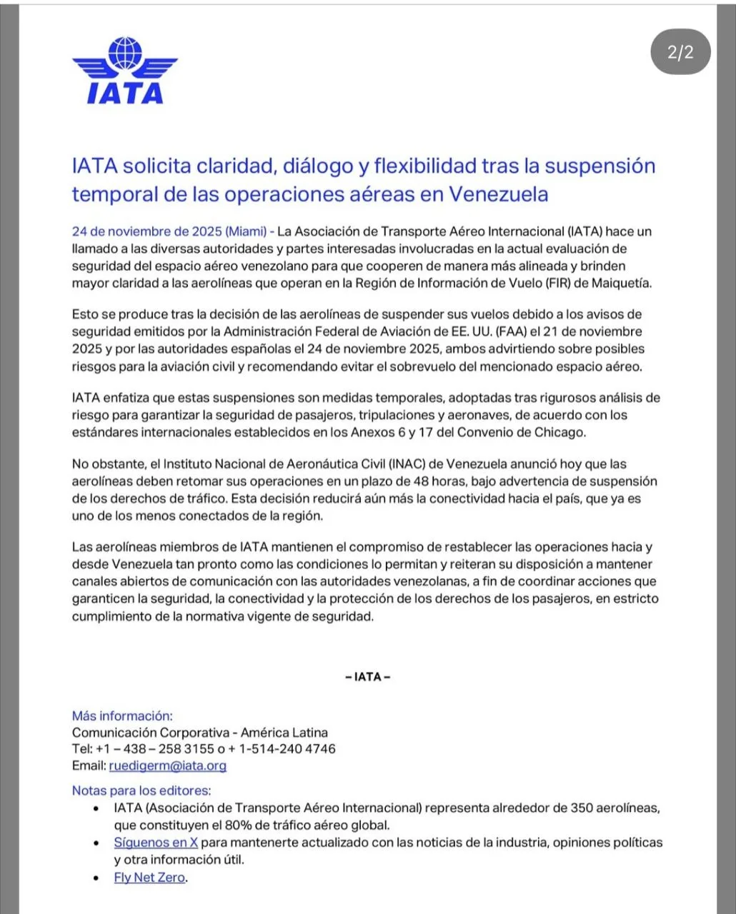 La postura de la institución venezolana la compartió la Asociación de Transporte Aéreo Internacional (IATA) mediante un comunicado en el que insta a las distintas autoridades y partes involucradas a hacer una evaluación de la situación para tomar decisiones cooperativas.