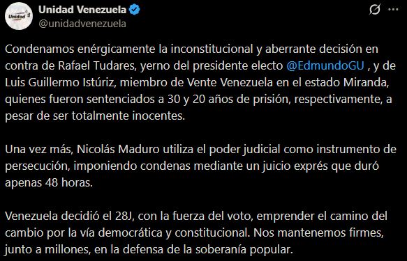 Condenamos enérgicamente la inconstitucional y aberrante decisión en contra de Rafael Tudares, yerno del presidente electo @EdmundoGU , y de Luis Guillermo Istúriz, miembro de Vente Venezuela en el estado Miranda, quienes fueron sentenciados a 30 y 20 años de prisión,…