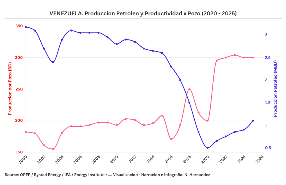 La evolución de la producción petrolera en Venezuela entre los años 2000 y 2025 refleja una historia de estabilidad inicial, colapso operativo y recuperación parcial. Tres variables permiten entender este proceso: la producción total de crudo, el número de pozos activos y la productividad promedio por pozo. A través de tres visualizaciones se puede seguir el hilo narrativo que conecta lo macro con lo micro, y lo técnico con lo estratégico.