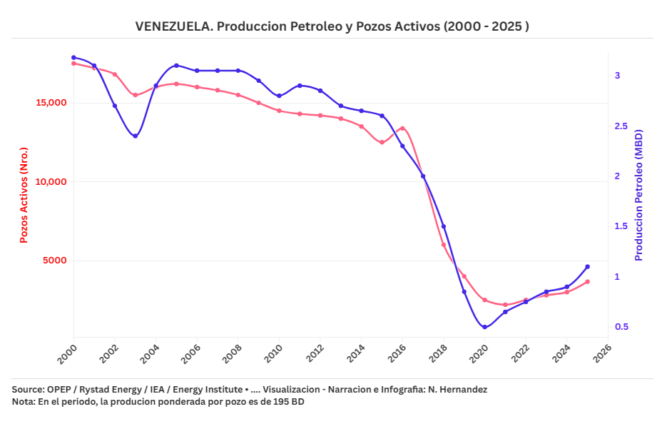 La crisis petrolera venezolana no se debió a la pérdida de reservas, sino a la desactivación masiva de pozos y al deterioro de la capacidad operativa. La productividad por pozo se mantuvo en rangos aceptables, lo que indica que el potencial técnico sigue presente.