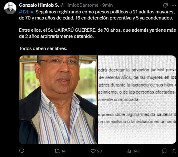 La información fue difundida a través de la cuenta oficial en X (antes Twitter) de Gonzalo Himiob, abogado y vicepresidente director de Foro Penal, quien detalló que 16 de estos adultos mayores se encuentran en detención preventiva, mientras que cinco ya han sido condenados, pese a su avanzada edad.