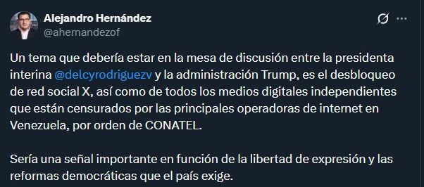 “Un tema que debería estar en la mesa de discusión es el desbloqueo de red social X, así como de todos los medios digitales independientes que están censurados por las principales operadoras de internet en Venezuela, por orden de CONATEL. Sería una señal importante en función de la libertad de expresión y las reformas democráticas que el país exige”, publicó el comunicador y director de La Gran Aldea, Alejandro Hernández.